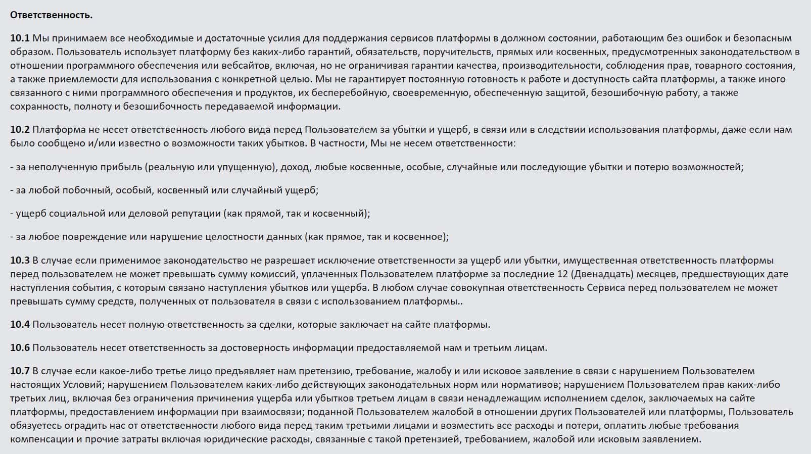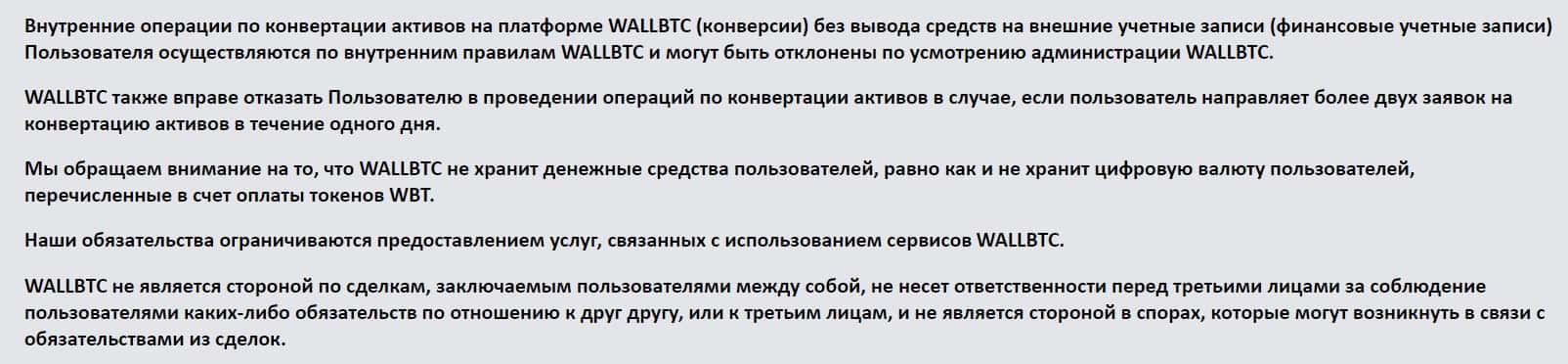 В разделе о снятии ответственности компания WallBTC заявляет, что не несет никакой ответственности за любые убытки пользователя на своем сайте.