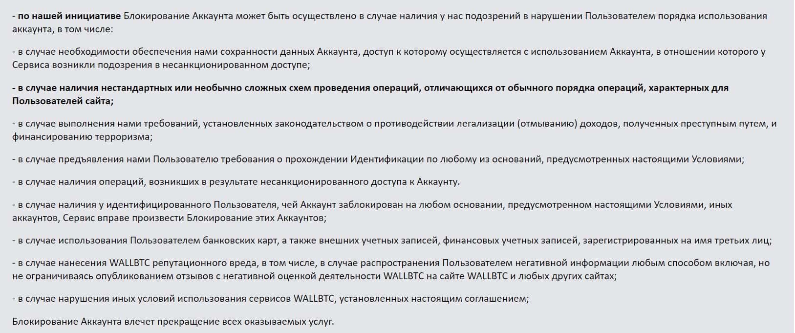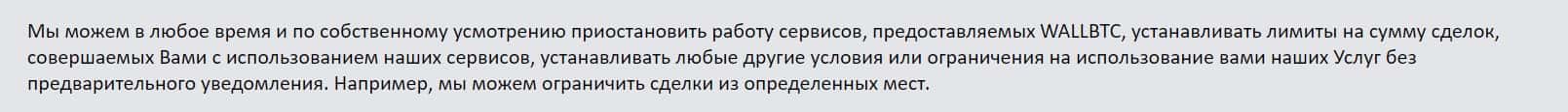 Также в договоре WallBTC имеется пункт о том, что компания может приостановить действие сервиса в любой момент, а также ограничить лимиты на сделки.