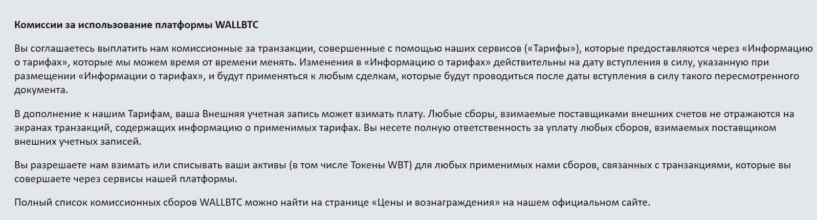 В разделе о комиссиях пользователь может узнать о комиссиях, применяемых на сайте WallBTC.
