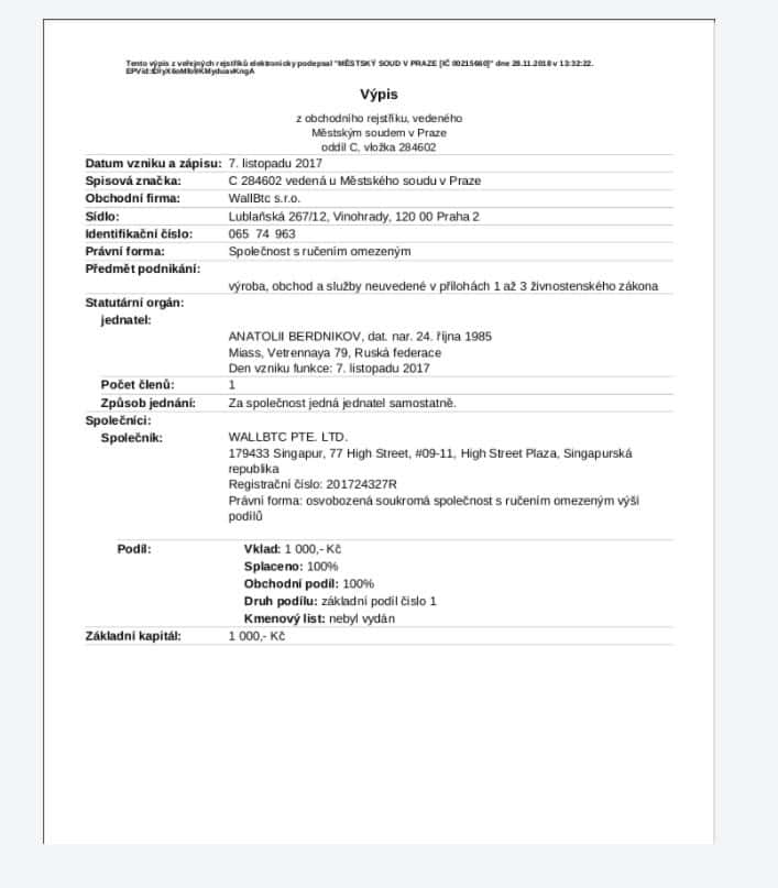 Мошенники WallBTC выложили у себя на сайте лицензию, полученную в Чехии. Даже если она и настоящая, то это никак не поможет вернуть свои потерянные средства людям из России.