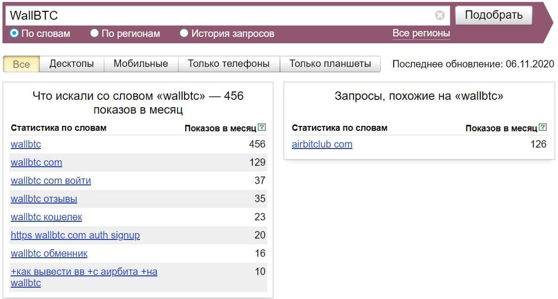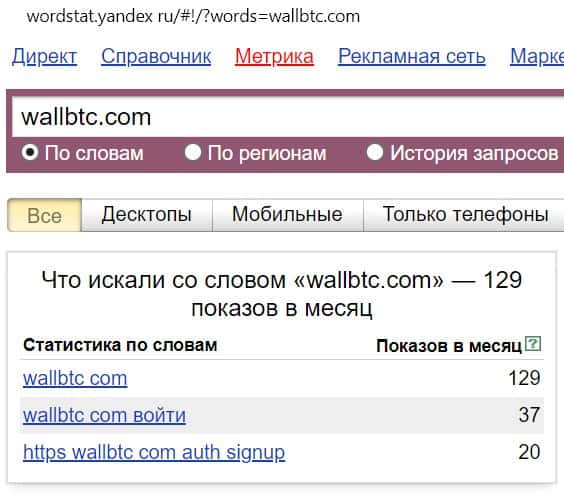 Название мошеннической конторы "WallBTC", написанное на английском языке, пользователи искали в системе Яндекс не очень часто, программа выдает 456 показов.