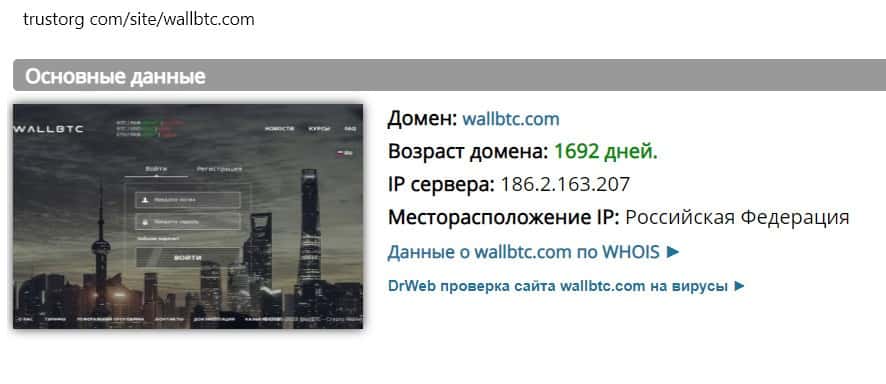 Судя по информации с сервиса Трасторг, домен wallbtc com существует 1692 дня. Вероятно, жулики перекупили его, чтобы создать легенду солидной фирмы со стажем.