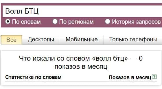 Посмотрим, сколько раз люди искали название бренда "Волл БТЦ" на русском языке с пробелами: результат 0 показов.