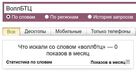 Название бренда на русском языке без пробела "ВоллБТЦ", пользователи не пытались найти в системе Яндекс ни разу.
