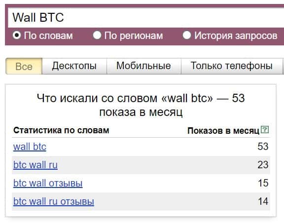 То же название "Wall BTC", но написанное с пробелами, люди пытались найти в системе Яндекс 53 раза.