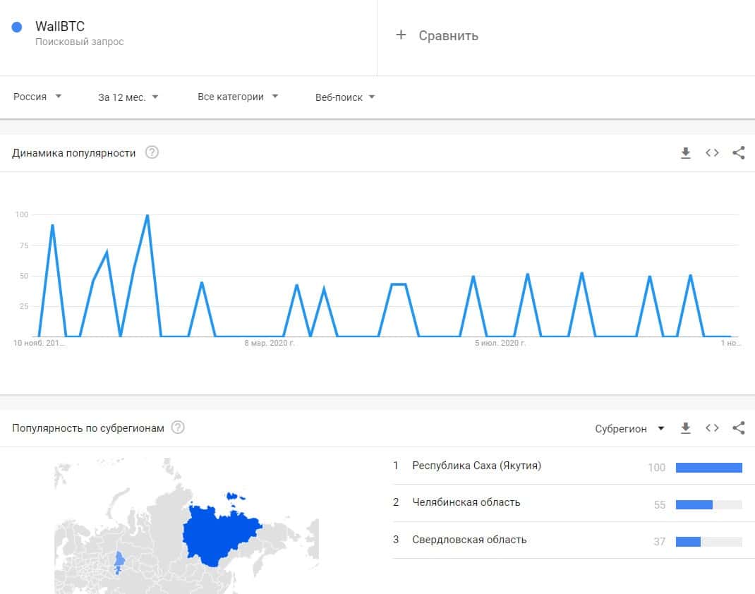 Посмотрим, насколько популярно название бренда "WallBTC", написанное на английском языке. Искали этот бренд в Гугл жители Якутии, Свердловской и Челябинской областей.