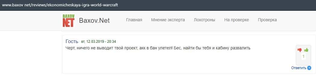 Клиент шулерского хайпа Ворлд Гейм Крафт указал в своем отзыве, что они заблокировали его счет, как только он создал заявку на вывод вложенных средств и прибыли по ним.