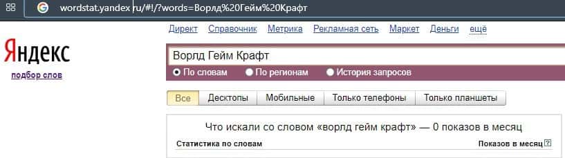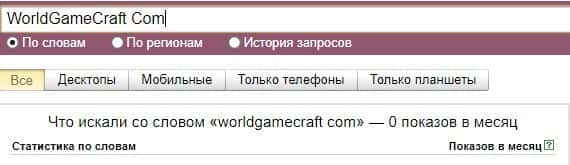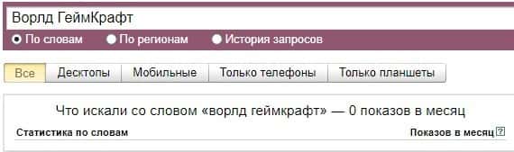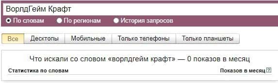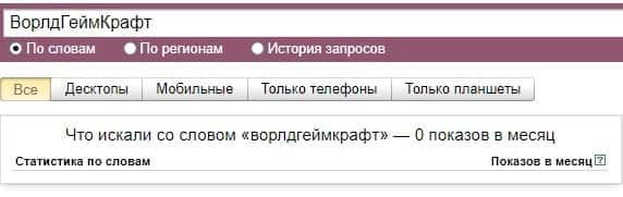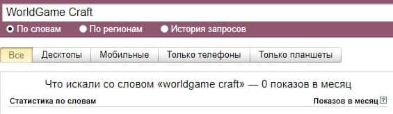 Что касается бренда мошенников "ВорлдГейм Крафт" в другом виде, то здесь другая ситуация ситуация согласно системе Яндекс.Вордстат и бренд набрал 0 показов за месяц.