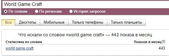 Касательно англоязычной версии бренда "World Game Craft", здесь есть что сказать, так как они по версии Яндекс Вордстат набрали 443 показов за последний месяц.
