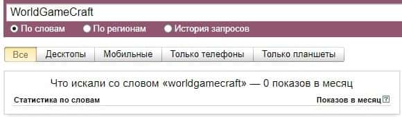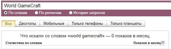 Ниже вы можете ознакомиться с брендом "WorldGameCraft" уже в другой вариации и поисковая система Яндекс все также показывает 0 запросов за последний месяц.