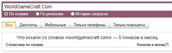 Если рассматривать поиск самого сайта "worldgamecraft com", только без точки в домене, то система Яндекс насчитала 0 показов за последний месяц.