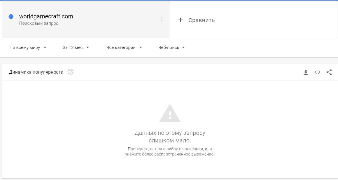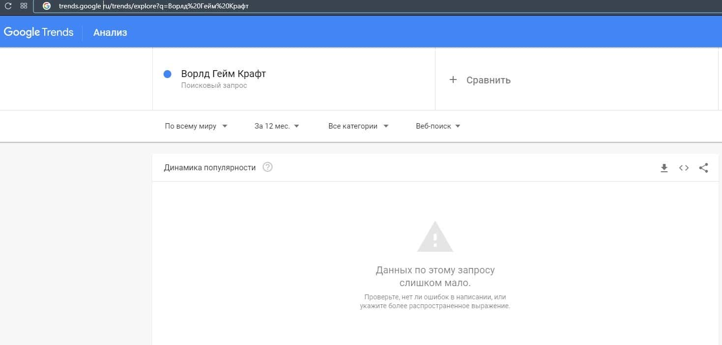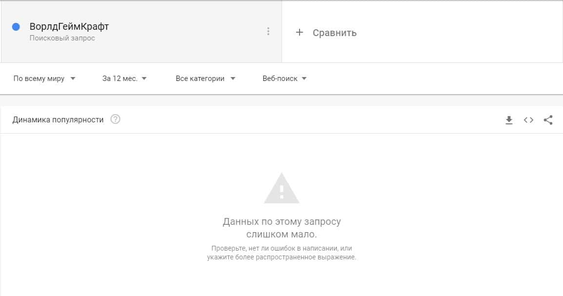 Что касается бренда "Ворлд ГеймКрафт", то здесь Гугл Трендс также не смог найти никаких данных, потому что запросов в поиске слишком мало.