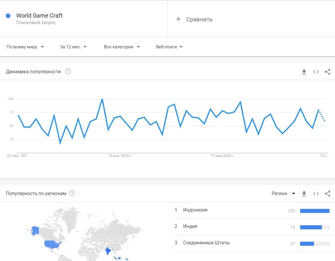Касательно бренда "WorldGameCraft" по версии Гугл Трендс, системой было найдено слишком мало данных по их запросам, что показывает их непопулярность.