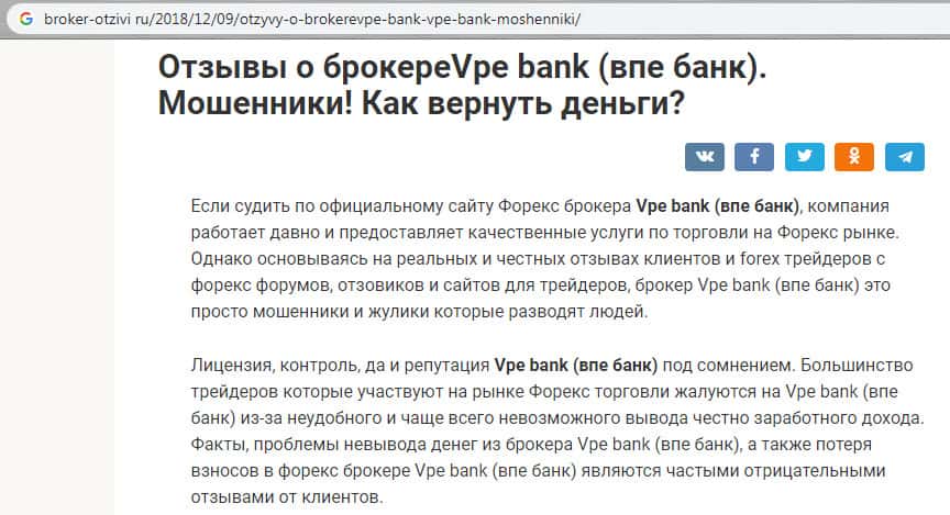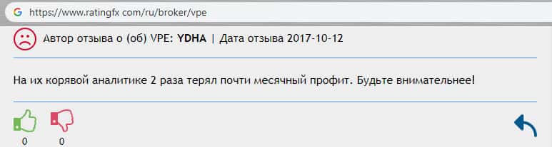На одном из известных социальных сетей пользователь очень сильно не рекомендует этого брокера. Трейдер рекомендует быть крайне осторожным при работе с ними. Кроме того, он поставил негативную оценку, что доказывает то, что его комментарий не куплен, в отличии от большинства комментариев в сети о шараге vPE Bank.