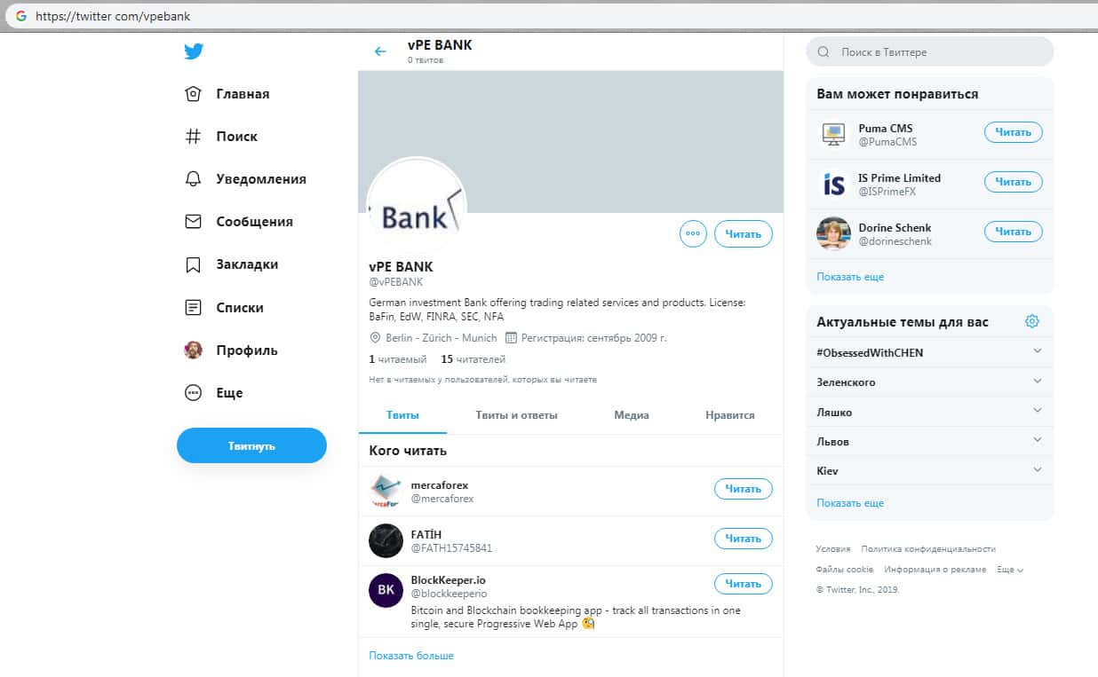 И так. Мы имеем две страницы шулеров во всемирной паутине. Это страница в Facebook и Twitter. Эти страницы у крипто-кухни вПЕ Банк не пользуются большой популярностью, как бы это странно не звучало. Но тем не менее, они существуют только ради того, чтобы завлекать новых пользователей, которые мало знают о рынках и новички. Перейдем же к страницам: