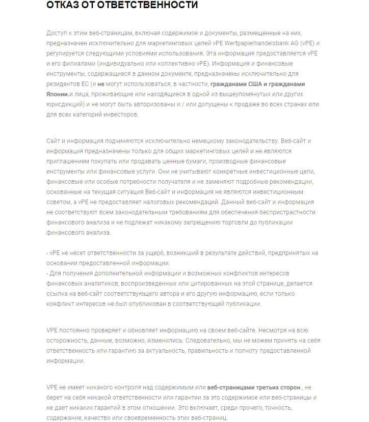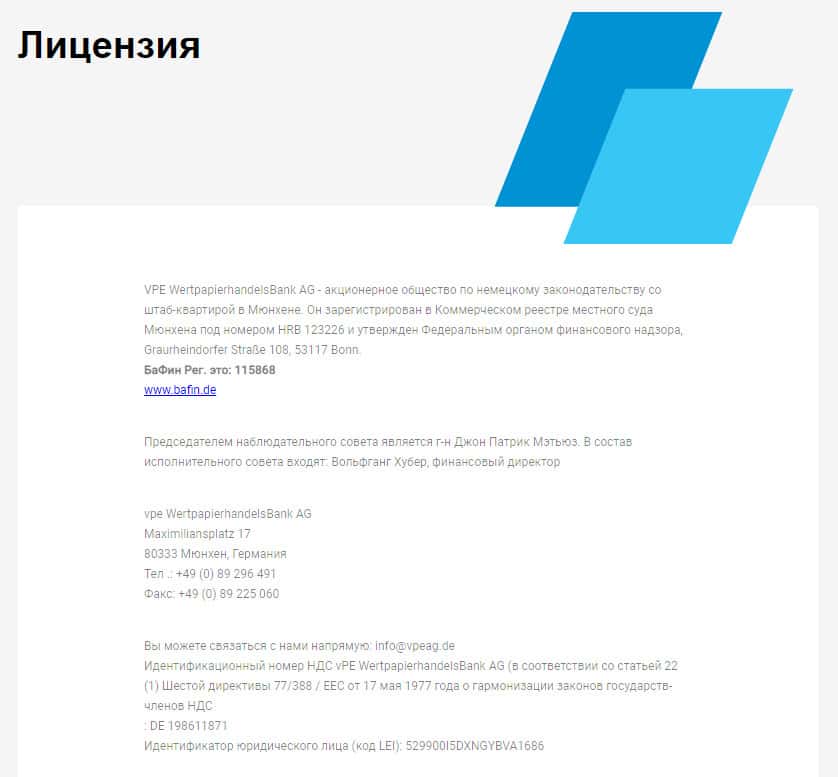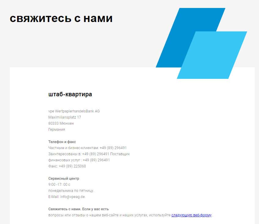 - адрес штаб-квартиры - vpe WertpapierhandelsBank AG, Maximiliansplatz 17, 80333, Мюнхен, Германия;