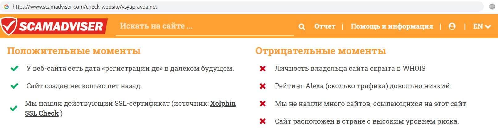 Мнение интернет ресурса scamadviser com о сайта жуликов vsyapravda net