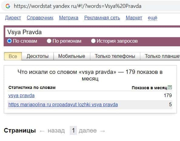 Так же мы проверили количество запросов конторы аферистов VsyaPravda Net по названию компании, но с пробелом, а именно "Vsya Pravda". 179 раз пользователи совершили этот запрос.