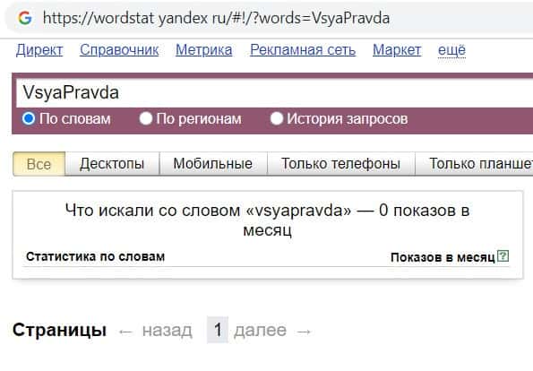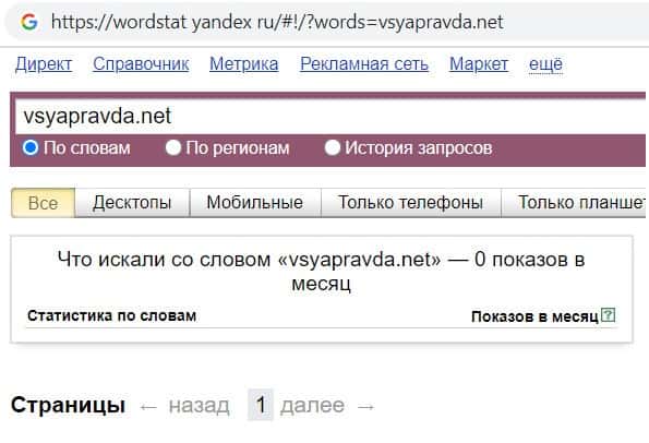 Напоследок мы проверили количество запросов фирмы VsyaPravda Net по домену фирмы с точкой, а именно "vsyapravda net", но данный запрос пользователи так же не выполняли.