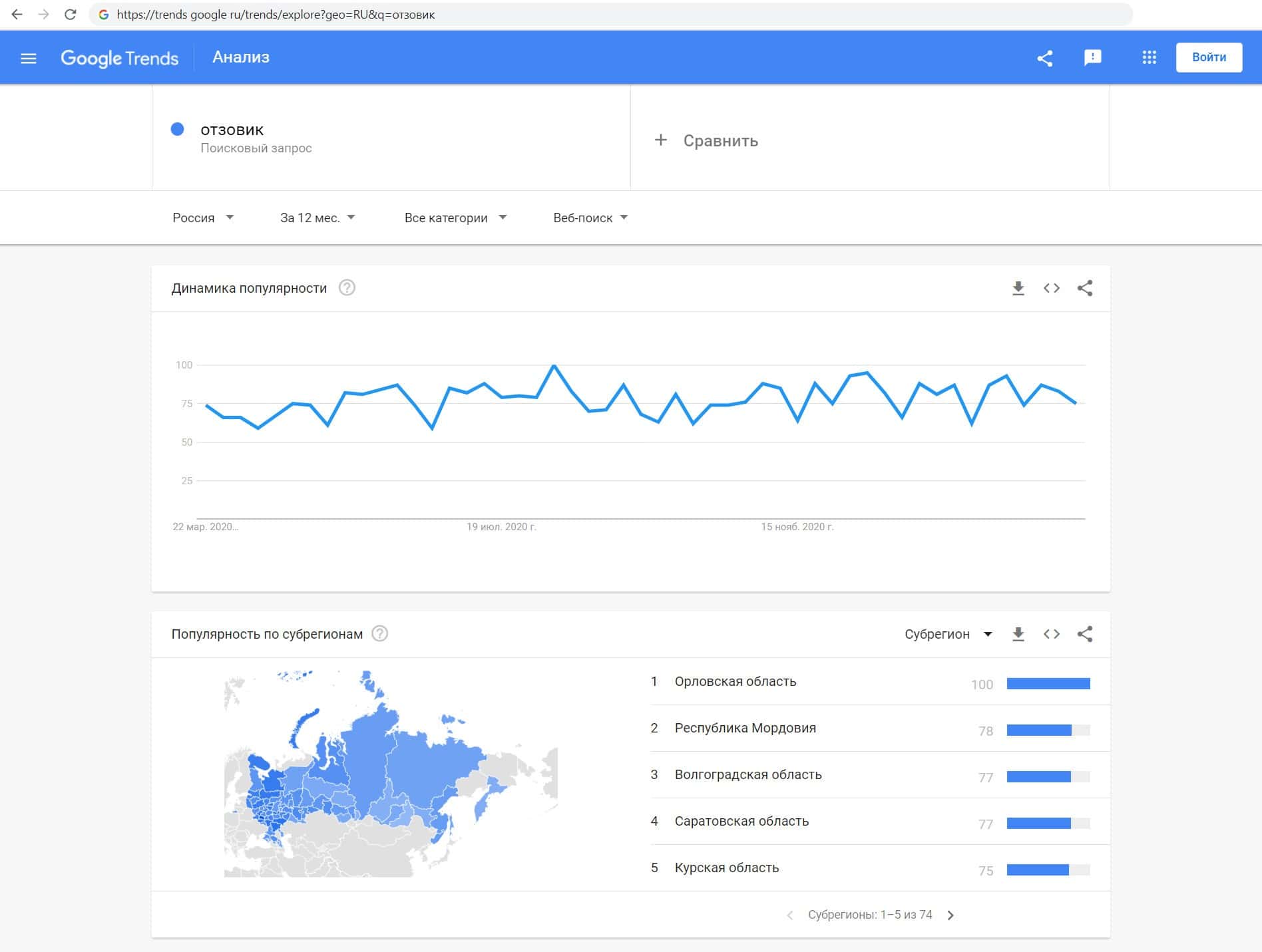 Так же мы проверили количество запросов VsyaPravda Net по русскоязычному названию, а именно "отзовик". Этот запрос в основном совершали пользователи из Орловской области.