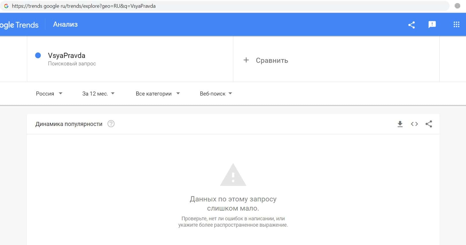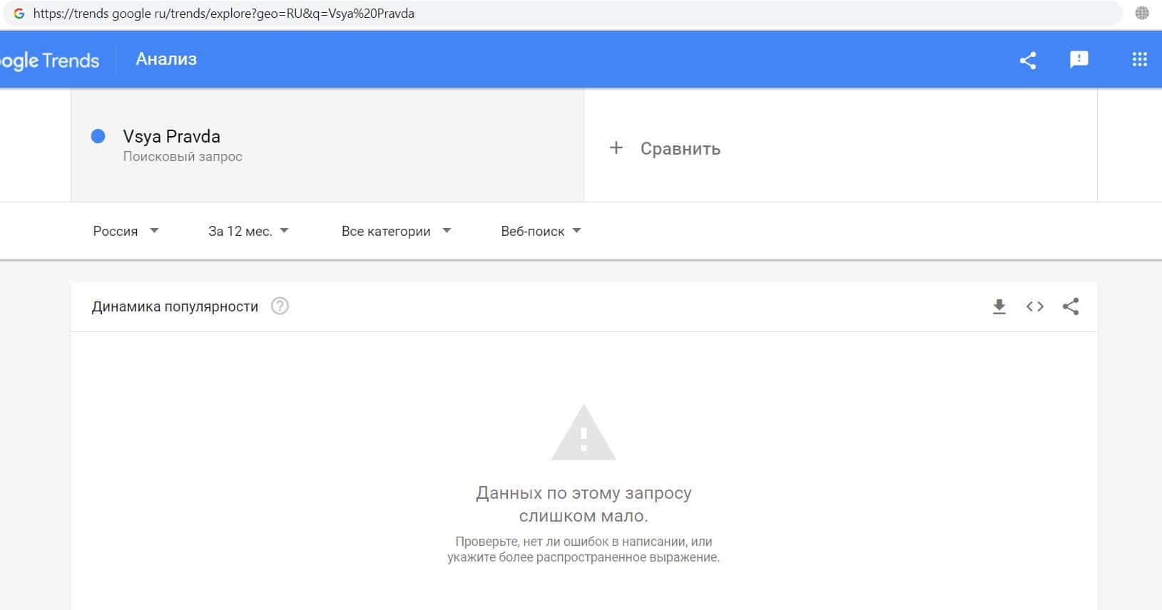 Мы решили проверить количество запросов компании кидал VsyaPravda Net в Google по названию конторы, а именно "VsyaPravda". Данный запрос пользователи не выполняли.
