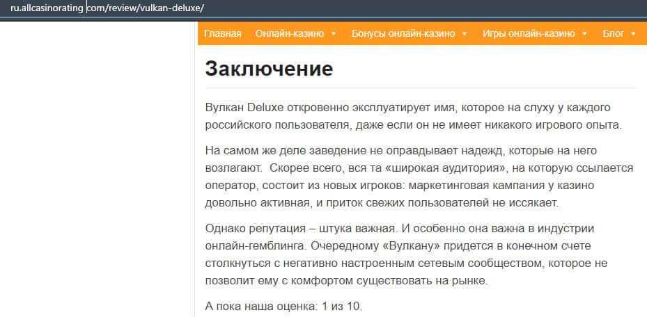 Далее представлено заключение с одной из статей, где полностью расписывается деятельность лохотрона Вулкан Делюкс и они не советуют связываться с этой шарагой.