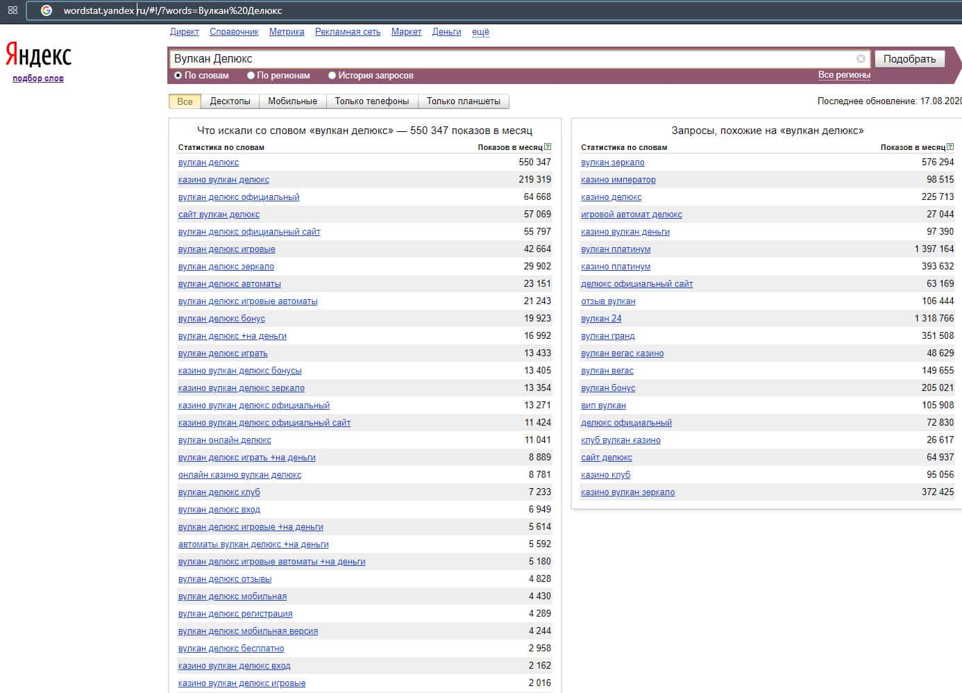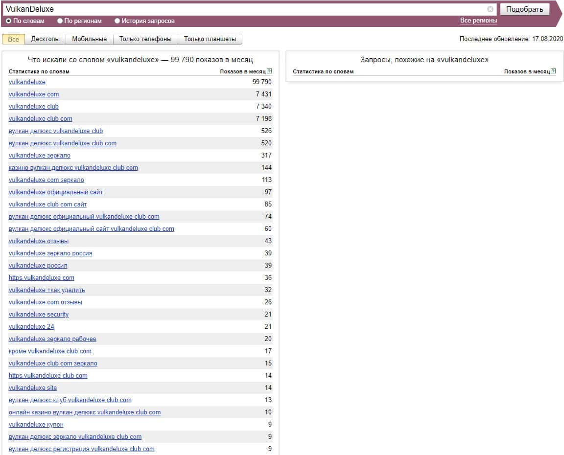 Высокие показатели с запросами бренда "Вулкан Делюкс", которые показывают просто огромную популярность этой мошеннической конторы в Яндекс.