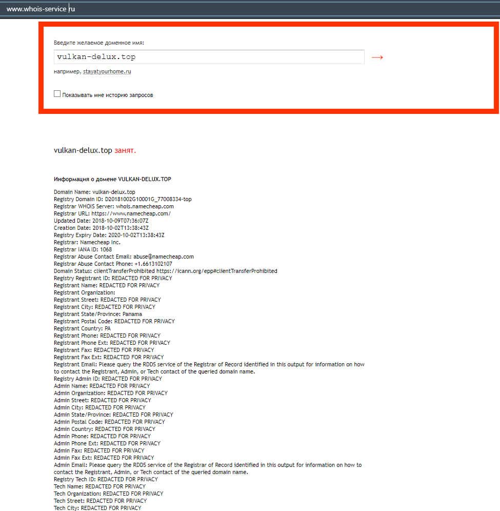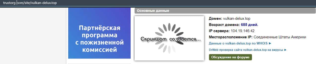 - Возраст домена аферистов Вулкан Делюкс