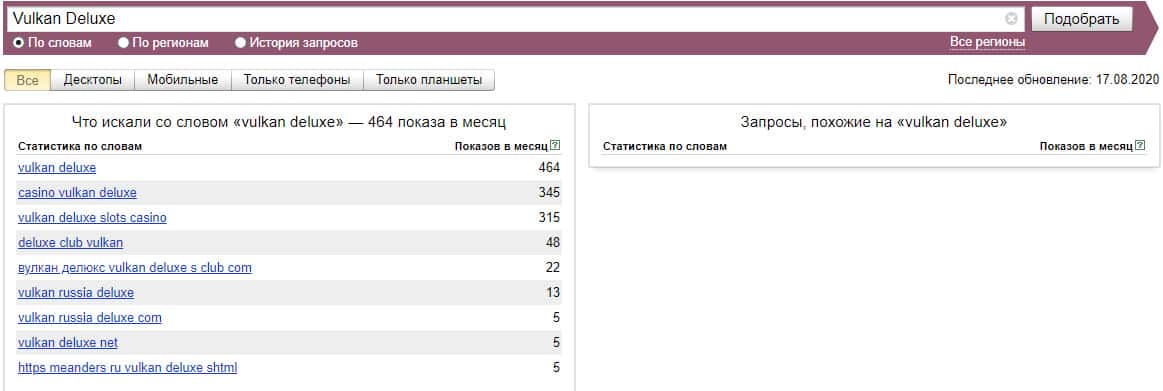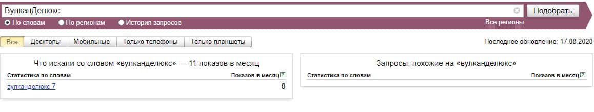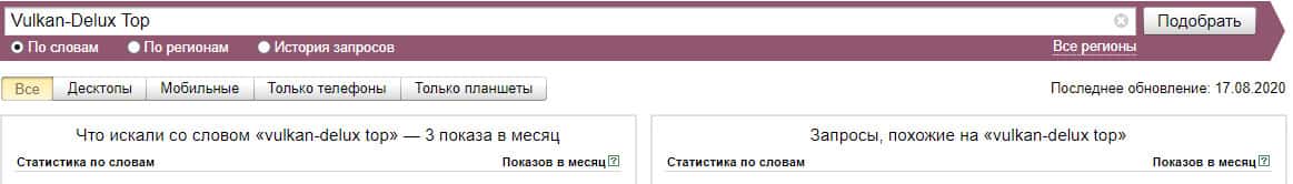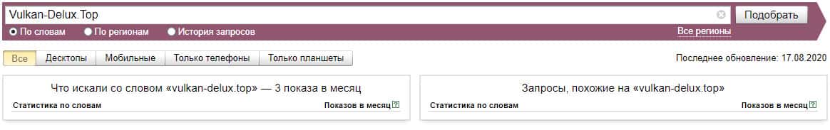 Если взять и пробить в Яндекс.Вордстат чисто домен сайта без точки "vulkan-delux top", то система выдает нам 3 показа в месяц.