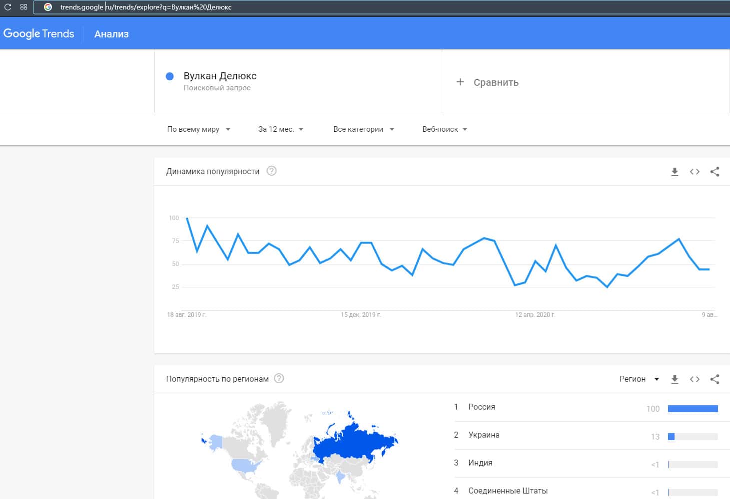 По запросам бренда псевдо-казино "Вулкан Делюкс" была некоторая динамика на протяжении этого года и в основном запросы с Украины, России и Индии.