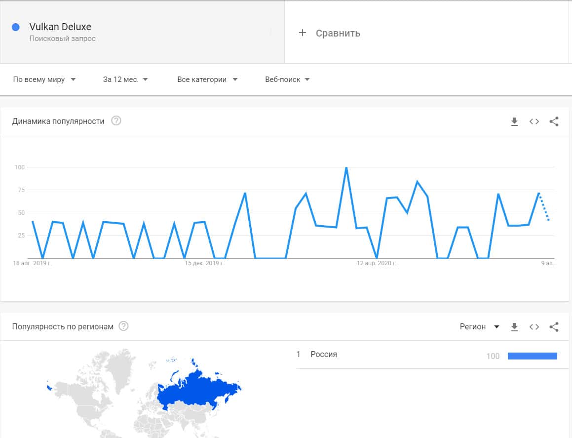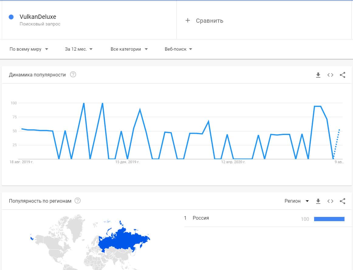По поводу запроса бренда "Vulkan Deluxe", шулерская организация не набрала особой популярности, но все же есть динамика запросов в основном с России.