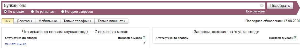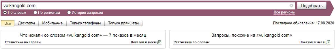 Также и ситуация и с брендом "vulkangold com", который менее популярен по версии Яндекс.Вордстат, потому что набрал 7 показов за месяц.