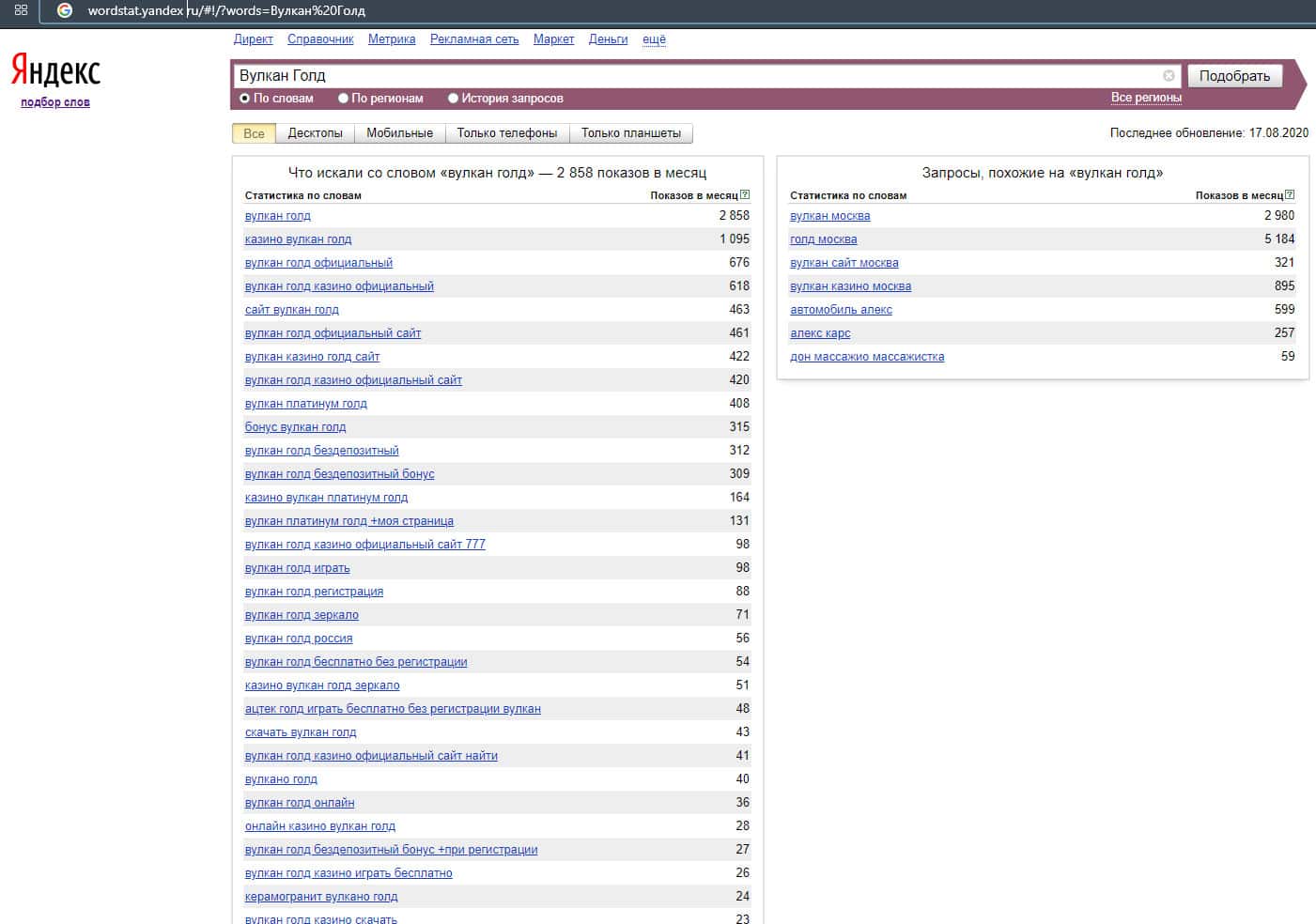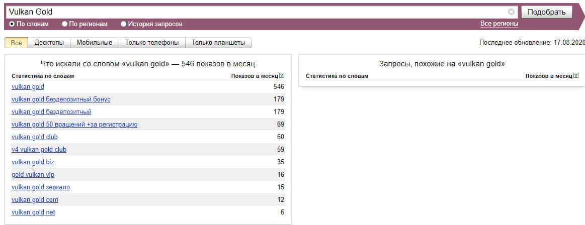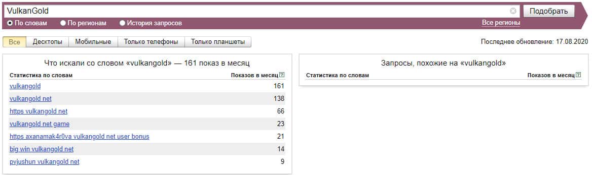 Что касается запроса "vulkangold.com" так здесь такая же ситуация. Всего 0 запрос в месяц выдала поисковая система Гугл.