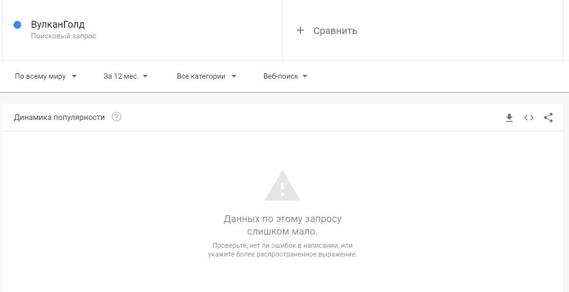 Ниже мы решили проверить бренд "ВулканГолд" в разных вариациях и в данном случае бренд вообще не искался по статистике Гугл Трендс.