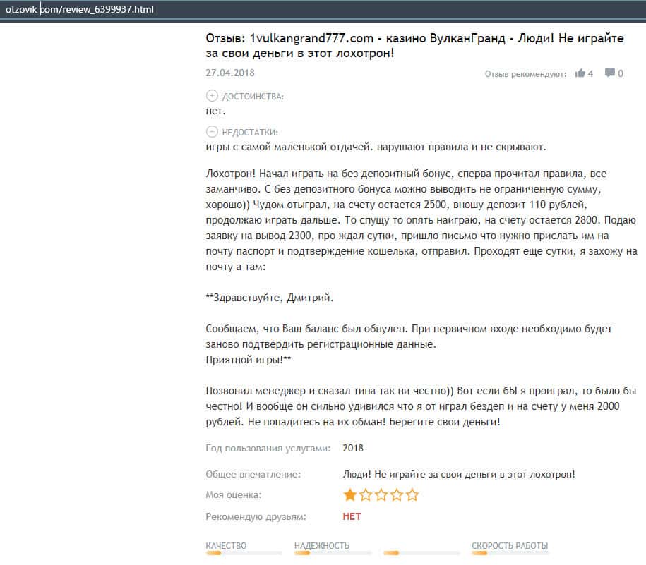 Очередной игрок указал в своем отзыве, что мошенники Vulcan Grand Kazino не дают выиграть, так как они будут бесконечно выпрашивать деньги у клиентов.