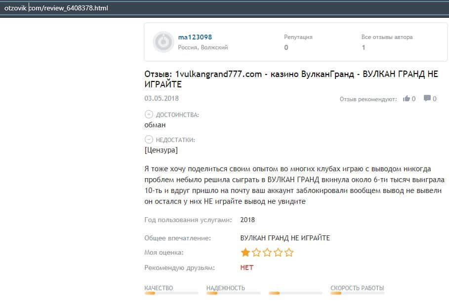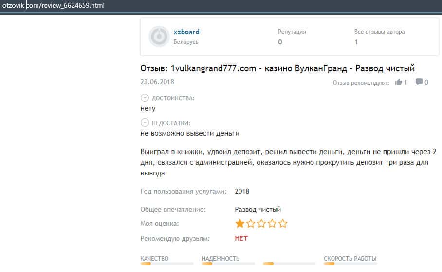 - Отзывы игроков о лохотроне Вулкан Гранд