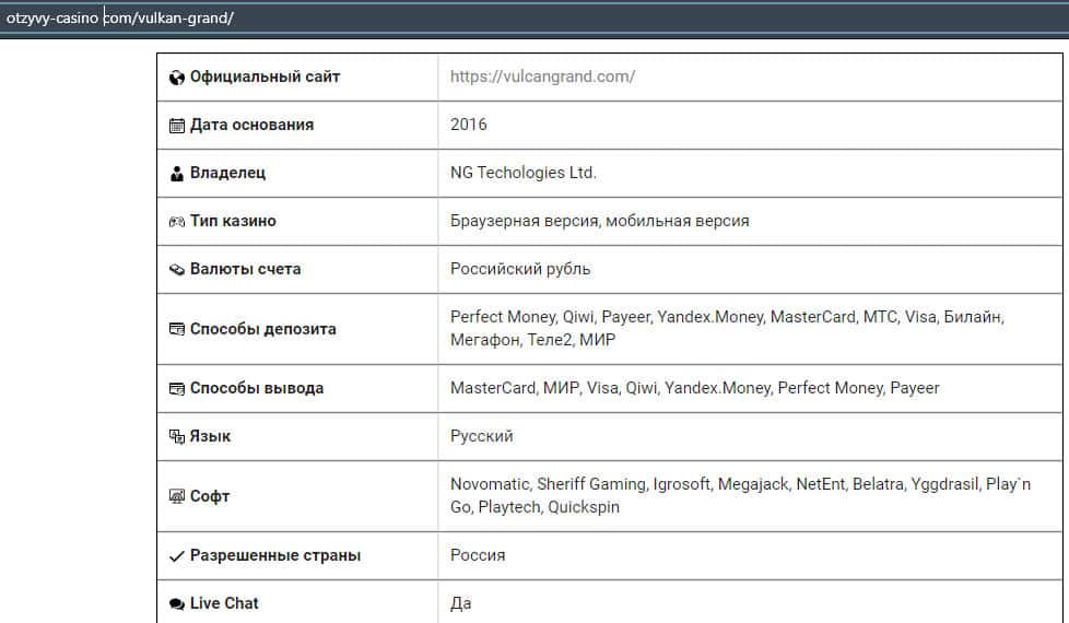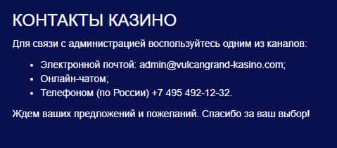 Далее представлен список контактных данных Вулкан Гранд, которыми они пользуются при общении с клиентами, но не факт что вам ответят, когда захотите вывести деньги: