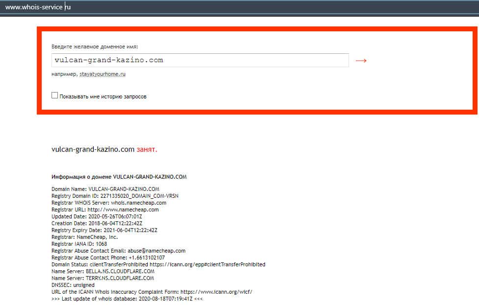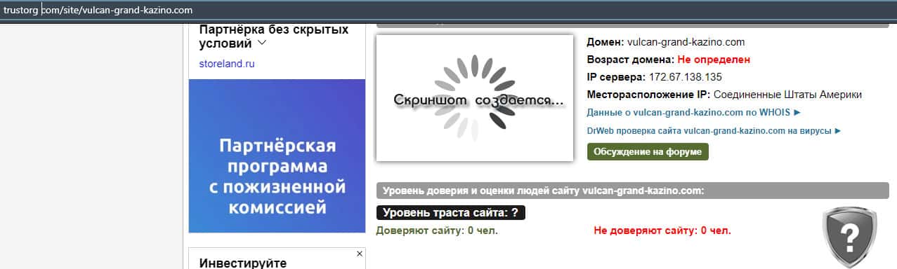 Исходя из информации на ресурсах по проверки доменов, сайт конторы Vulcan Grand Kazino создан неизвестно когда, так как мошенники скрывают эти показатели.