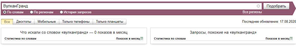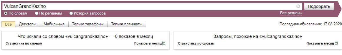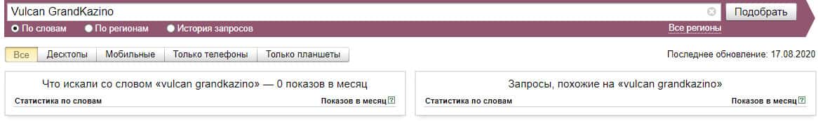 По бренду "ВулканГранд", шулерская контора также набрала ноль показов за месяц, потому что о них никто не знает вообще.
