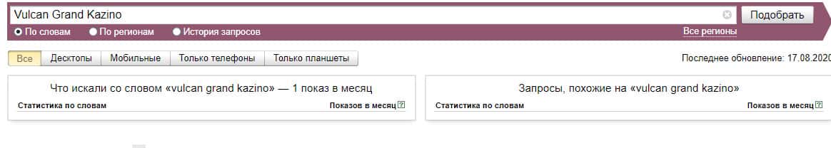 Информация о запросе бренда "Vulcan Grand Kazino" на сайте Яндекс Вордстат не распространенная, и набрала 1 показов за месяц.
