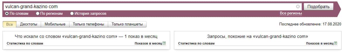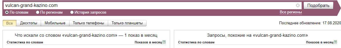 Мы также пробили сайт без точки в домене "vulcan-grand-kazino com" и система Яндекс Вордстат выдала 1 запрос за последний месяц.