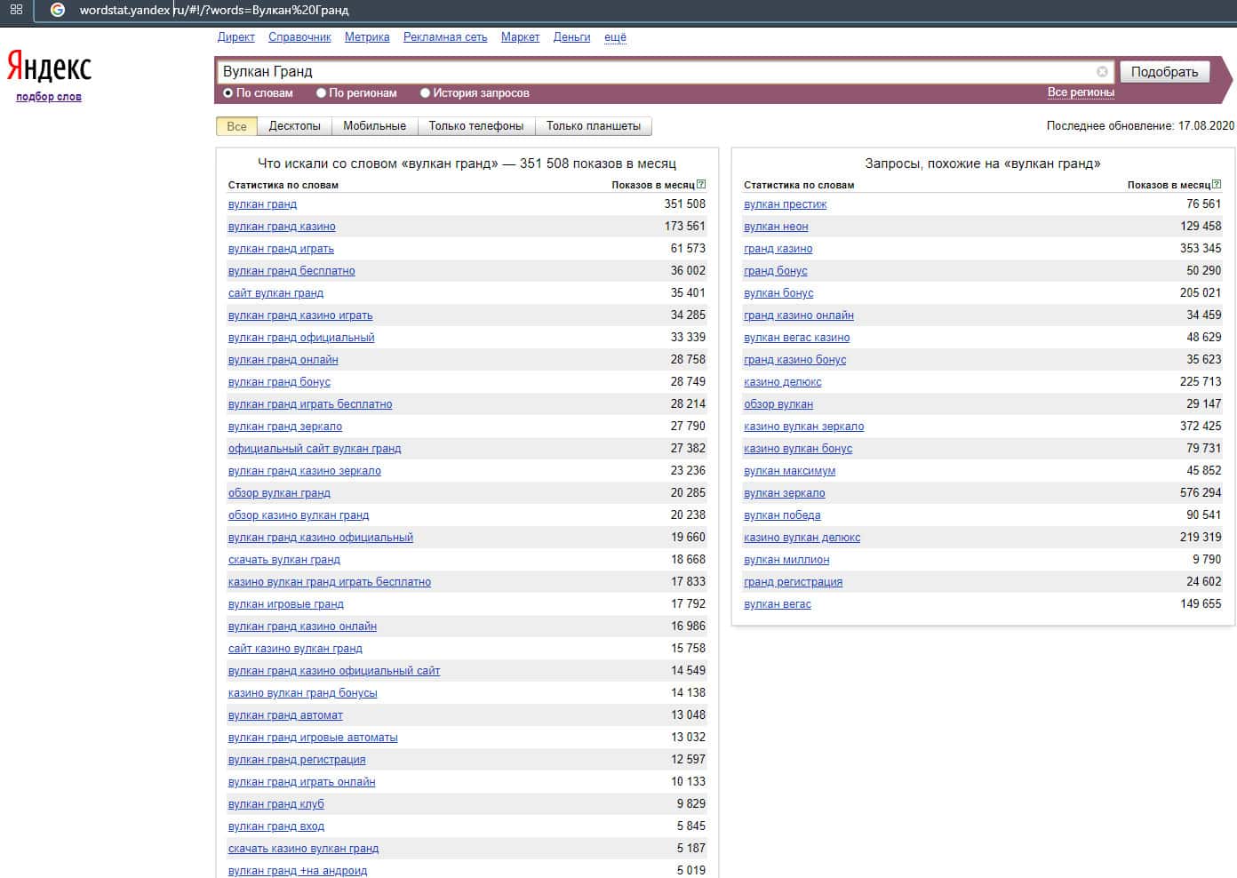 По версии Яндекс Вордстат мошенники с брендом "Вулкан Гранд" набрали огромное количество запросов в размере 351 508 запросов за месяц.