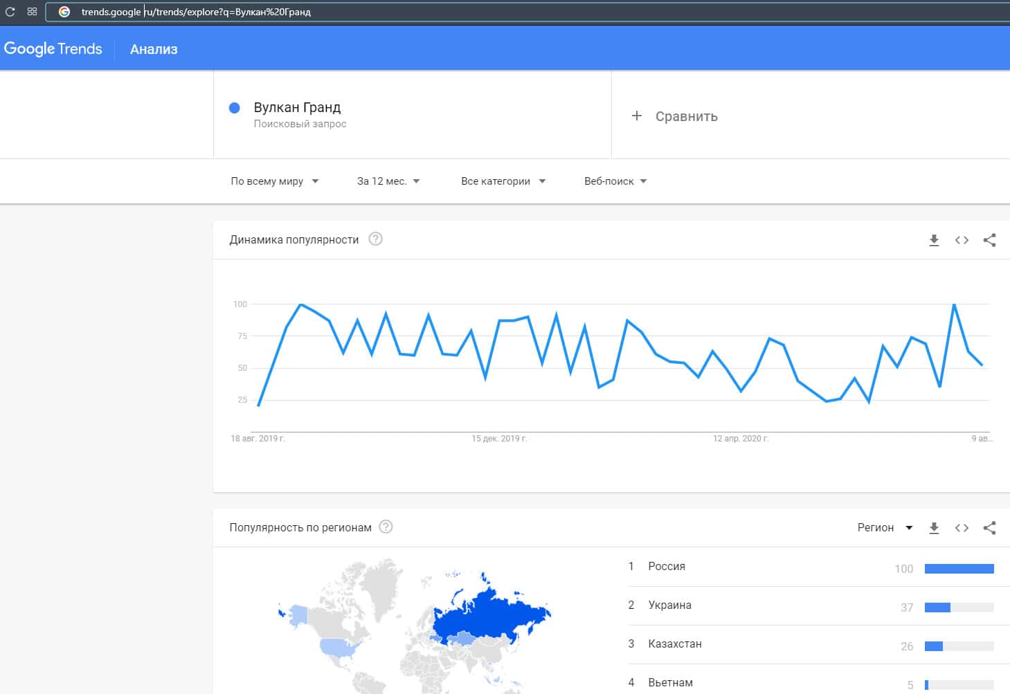 - Статистика запросов по брендам Vulcan Grand Kazino в Гугл