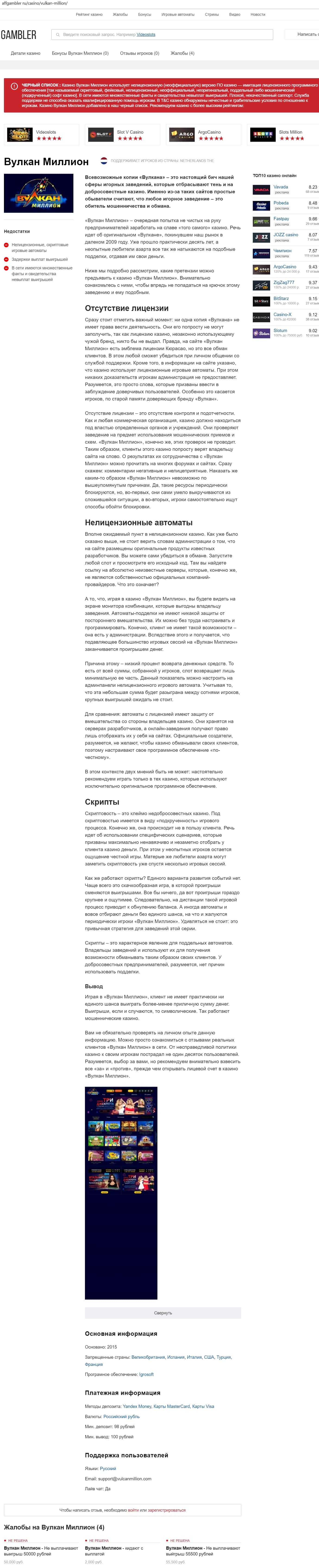 Сайт affgambler ru пишет в своем обзоре, что казино Вулкан Миллион является лохотроном. Из автоматы подкручены так, чтобы игрок всегда был в проигрыше.
