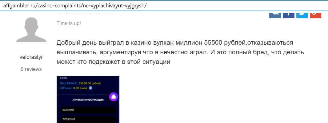 Валера написал жалобу на казино Вулкан Миллион, что ему не выплачивают 55 500 рублей. Администрация сказала, что он не играл нечестно, но то просто чушь.