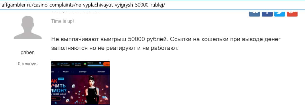 Другой игрок, которому не выплачивают выигрыш 50 000 рублей, пишет, что казино явно жульничает. Кошельки на их сайте не работают, поэтому выплату получить невозможно.
