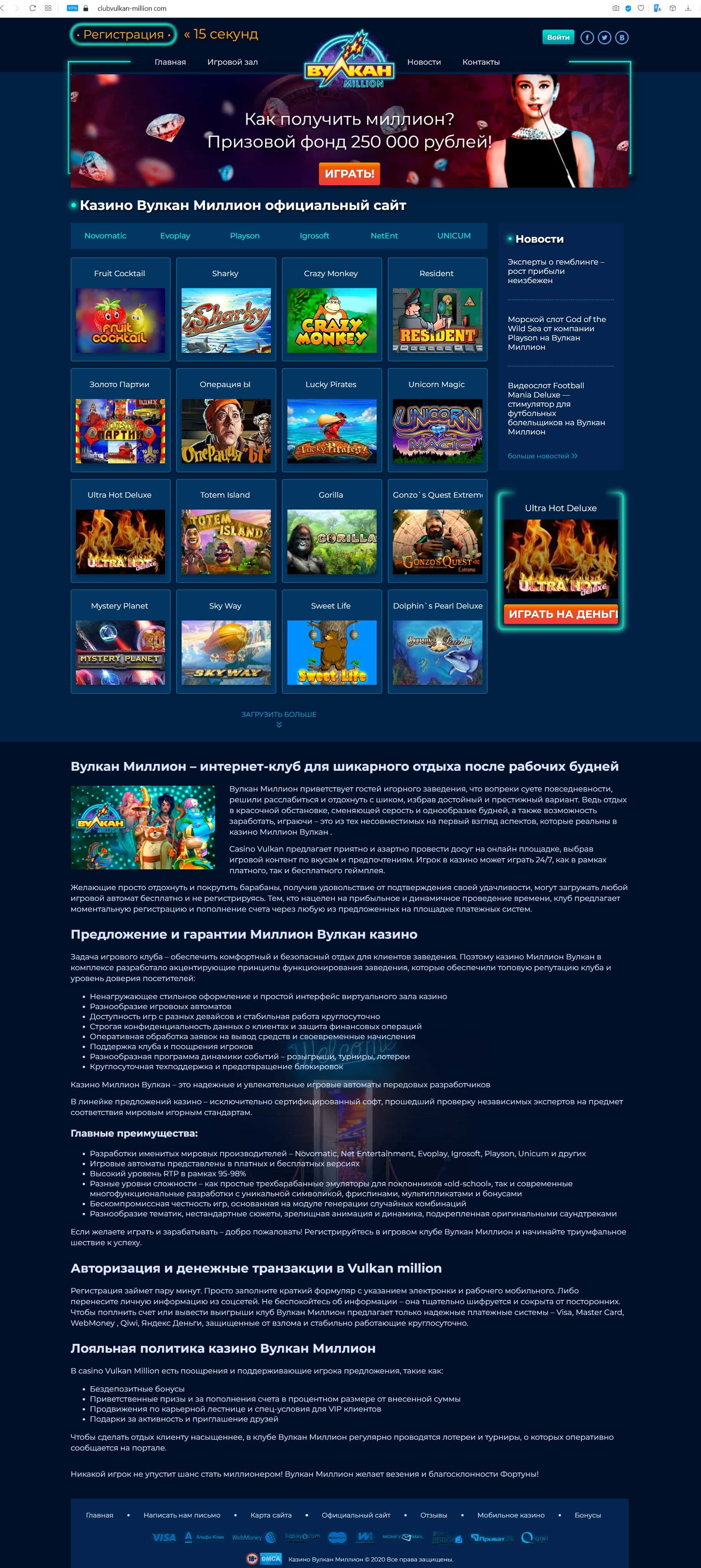 Главная страница он-лайн казино Вулкан Миллион практически неотличима от остальных казино Вулкан. Надо заметить, что сделана она некачественно, а автоматы подкручены.
