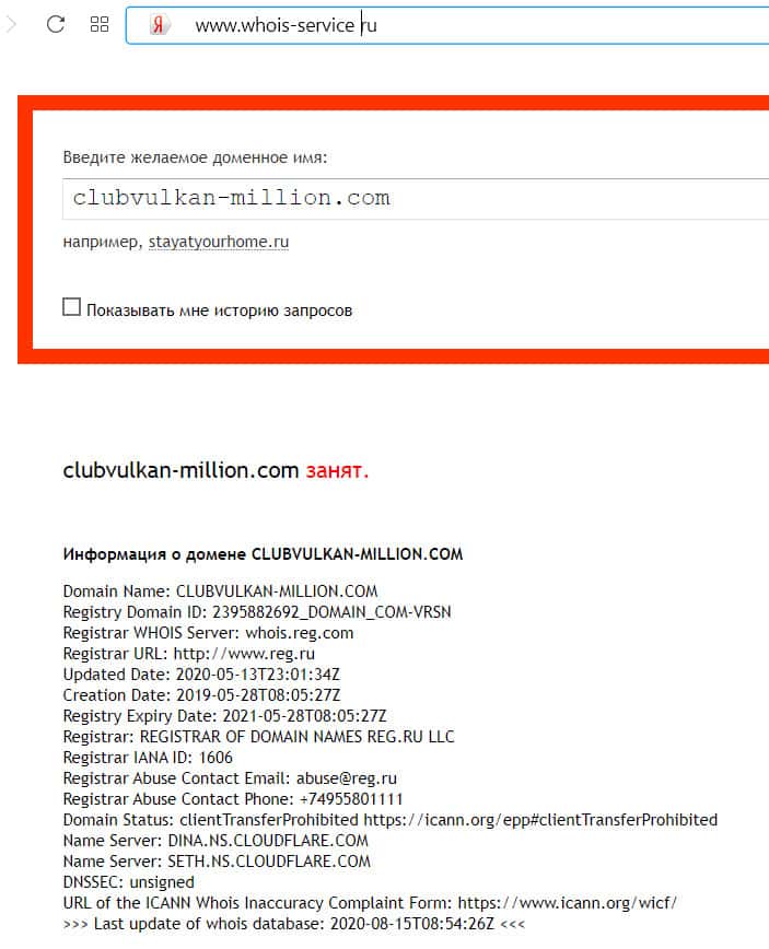 Кому принадлежит доменное имя сайта clubvulkan-million com?