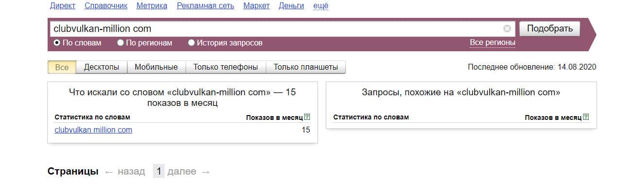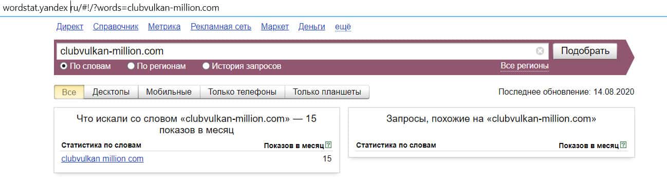 Количество запросов по доменному имени "clubvulkan-million com", написанного с пробелом, по данным сервиса Яндекс Вордстат, равно такой же цифре - 15 показов.