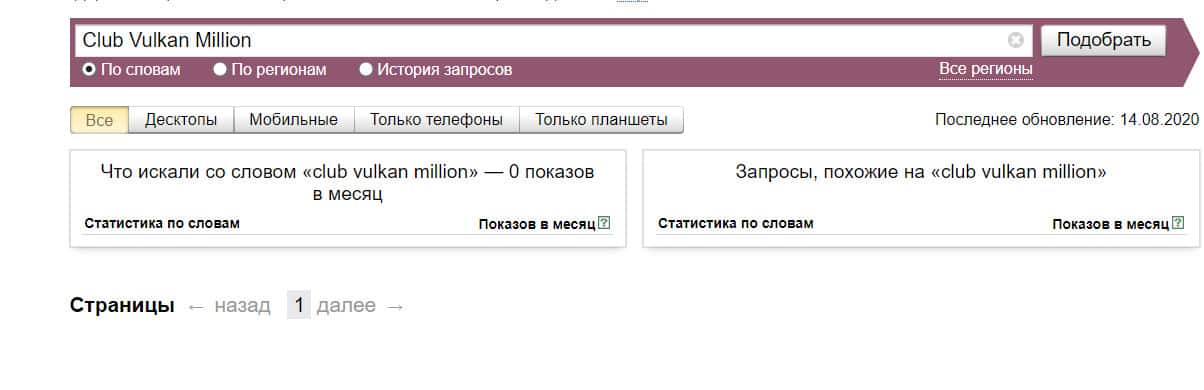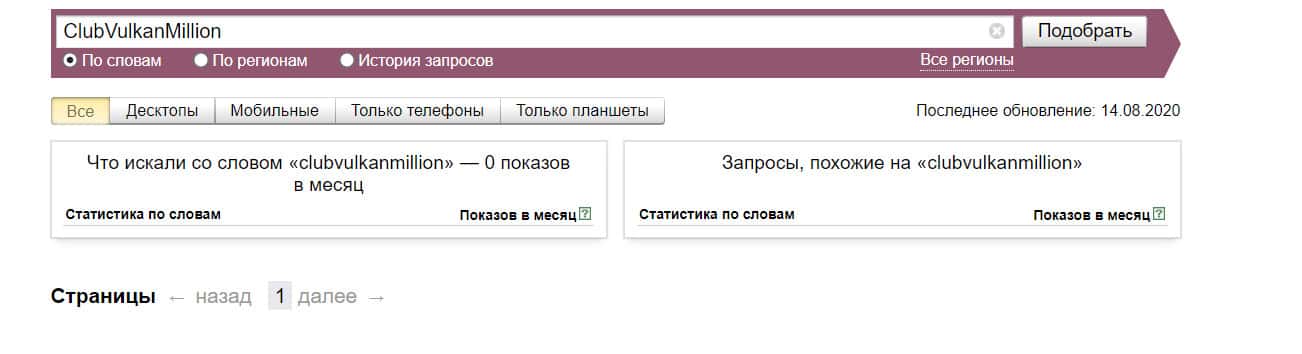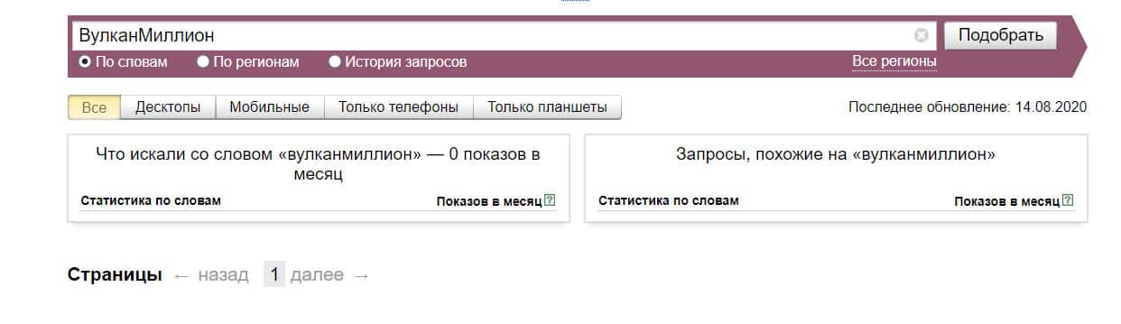 Название бренда "ВулканМиллион" на русском языке без пробела пользователи не искали в системе Яндекс, результат равен 0 показам.